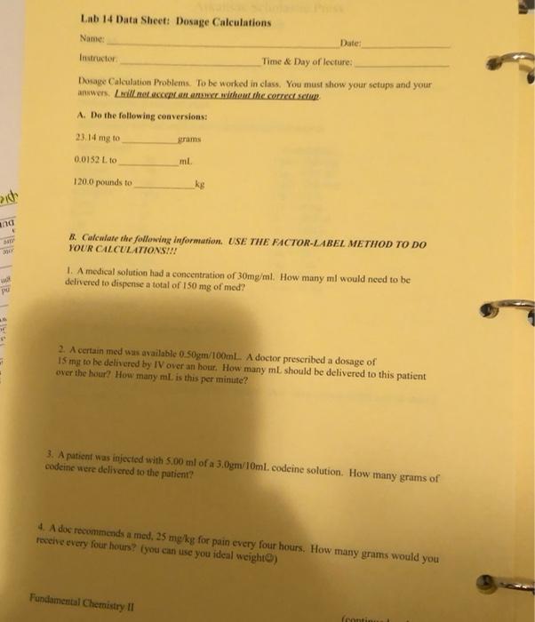 Solved Lab 14 Data Sheet Dosage Calculations Name Date Chegg Com